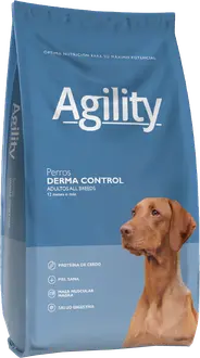 Alimento balanceado completo para perros adultos de 1 a 7 años a base de proteína de cerdo Agility Adulto Derma Control es un alimento especialmente formulado con proteína de cerdo, que por su baja alergenicidad ayuda a disminuir las probabilidades de aparición de alteraciones en la piel y sistema digestivo. Debido a su bajo porcentaje de grasas saturadas ayuda a desarrollar una masa muscular magra, favoreciendo una condición corporal ideal y un estado general óptimo. Su exclusiva formula esta basada en la tecnología Active Health: una combinación de nutrientes minuciosamente seleccionados para que tu perro mantenga siempre su máximo potencial.